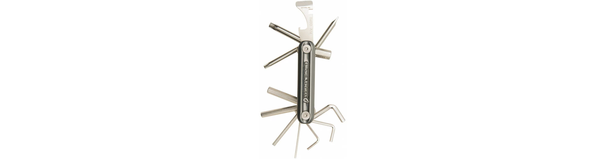 Outil multifonctions de 13 fonctions: Clé six pans (1.5/2/2.5/3/4/5/6/8), Torx (T25/T30), démonte valve, tournevis plat, ouvre plaquettes de freins, décapsuleur.
