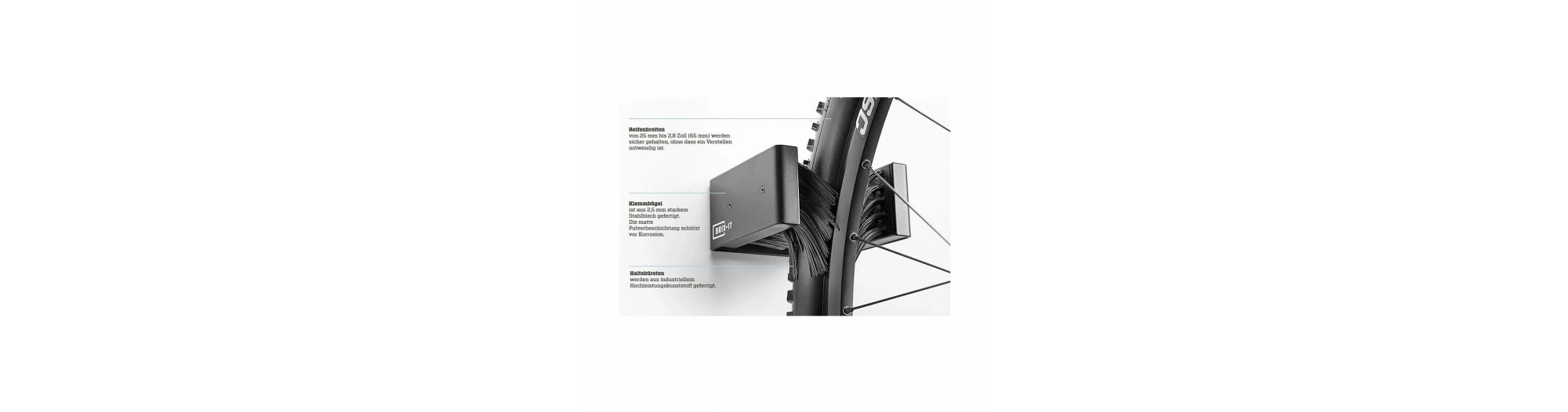 Le support peut être utilisé à l’intérieur comme à l’extérieur. Grâce au revêtement par poudre mat, l’étrier de serrage est résistant à la corrosion. Les brosses permettant la fixation sont en plastique industriel haute performance et s’adaptent à la forme du pneu lorsque le vélo n’a pas roulé depuis longtemps, mais reprennent toujours leur forme initiale. Il suffit de passer les doigts à travers les poils pour que le vélo suivant puisse être fixé solidement. En outre, en appuyant légèrement des deux côtés contre le support, tu peux réduire l’écart entre les brosses, de sorte que même les pneus étroits restent bien en place.