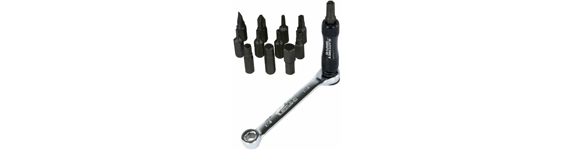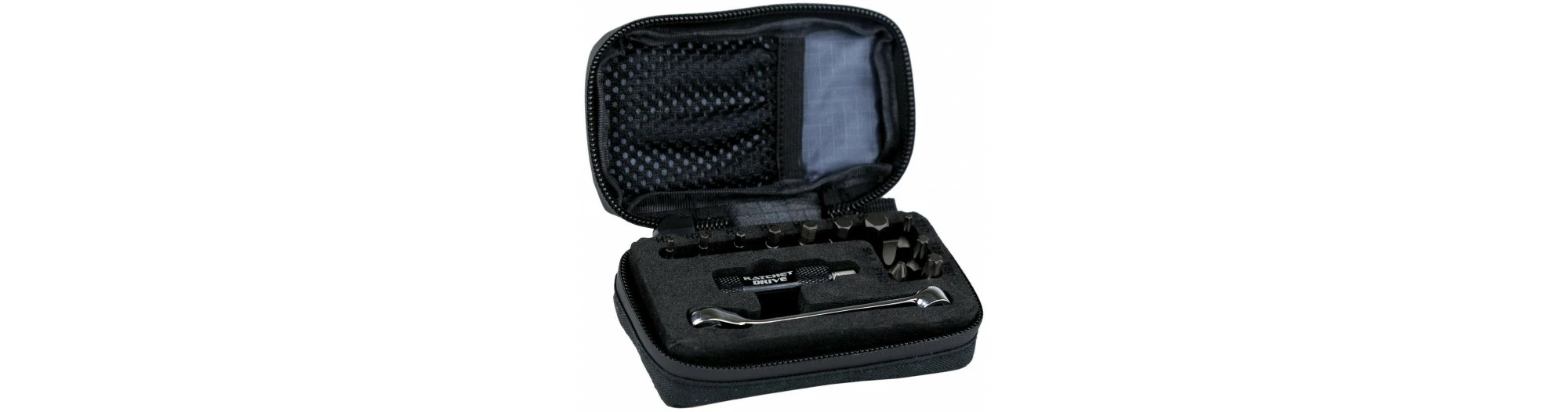 Clé à cliquet chromé durable et compact conçu pour les vélos. Cliquet à dents fines avec levier inverseur et ouverture fixe à l’extrémité opposée. Sélection des outils optimisée pour les vélos de route, de gravel et VTT. Embouts CRV (chrome vanadium) super résistants. Adaptateur d’extension en aluminium usiné sur mesure avec logo gravé au laser. L’aimant intégré maintient les embouts en place. Le kit à cliquet est livré dans un étui de transport compact et souple.Caractéristiques