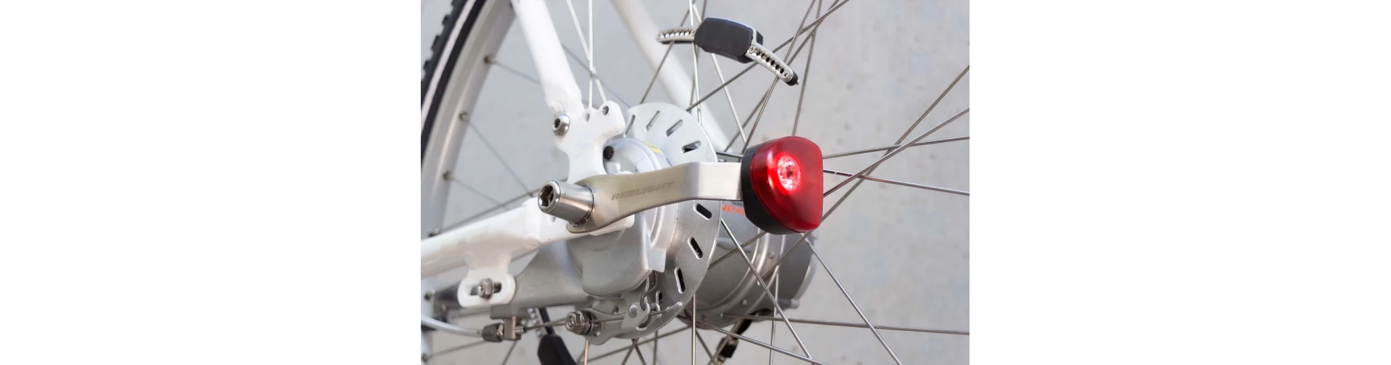 Le montage des feux de vélo est rapide et facile. Le feu de vélo est monté sur le moyeu. Il est conçu pour tous les vélos avec des freins v-brakes, des freins tambours ou des freins à disque (max. 180 mm). La puissance lumineuse correspond à un feu à piles ordinaire avec des piles neuves. Le feu de vélo produit sa propre énergie d’induction respectueuse de l’environnement au moyen d’une bobine dans la dynamo et d’aimants sur les rayons du vélo – sans aucune utilisation de piles.