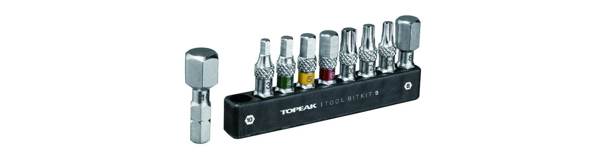 La Topeak Torq Stick 4 -20 Nm permet d’obtenir le bon couple de serrage. Grâce à la molette de réglage, on peut sélectionner le couple de serrage souhaité entre 4 et 20 Nm dont la valeur s’affiche dans la fenêtre située juste au-dessus. Tu peux ainsi serrer des pièces du cadre ou d’autres composants avec la force adéquate. Il est possible de choisir le sens serrage ou desserrage. Le jeu de 9 embouts comprend des embouts à empreinte hexagonale de longueur 30 mm permettant d’atteindre des vis difficiles d’accès sur le vélo. La partie moletée simplifie leur retrait du porte-embout.