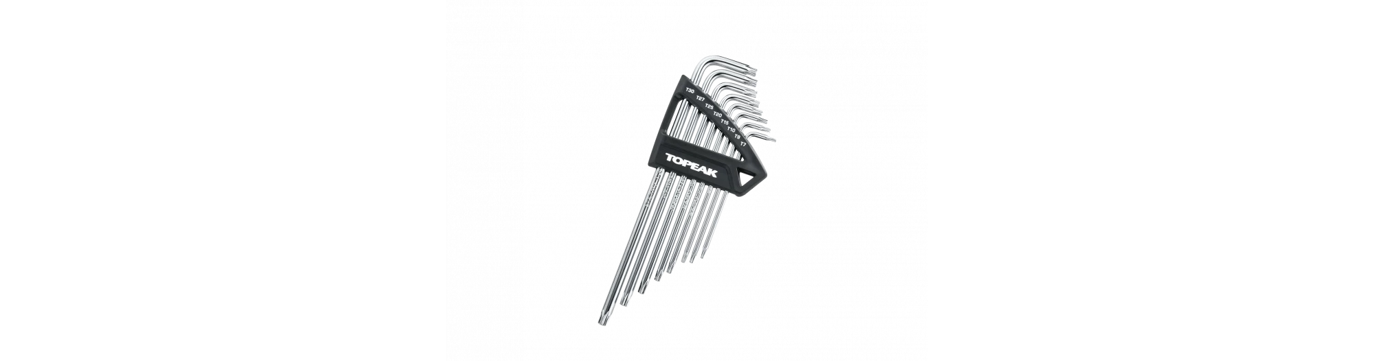 Avec le jeu de clés Torx® Topeak DuoHex, tu as les clés Torx® les plus courantes à portée de main. Le jeu se compose de 8 clés en L de grande qualité en acier au chrome-vanadium. Le crochet dépliable intégré au support permet d’accrocher l’ensemble sur un panneau porte-outils.