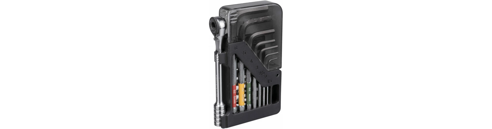 On peut difficilement faire plus compact. Topeak a intégré dans son Omni ToolCard un jeu d’embouts avec clé à cliquet et 7 clés Allen à tête sphérique. Ce jeu de 15 fonctions ultra plat rentre dans n’importe quelle poche de maillot ou sacoche de selle. La clé à cliquet avec des embouts à code de couleur facilite le vissage et les clés Allen à tête sphérique permettent d’atteindre des vis difficiles d’accès.Caractéristiques
